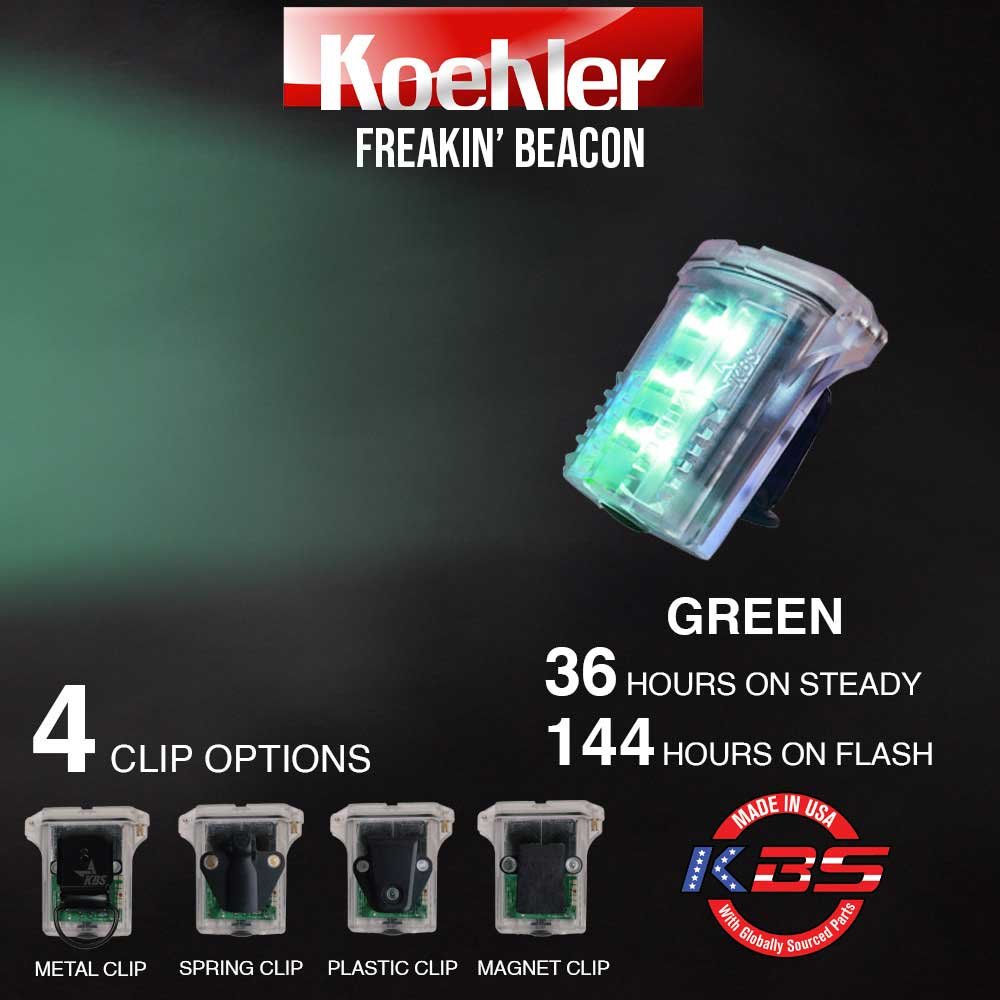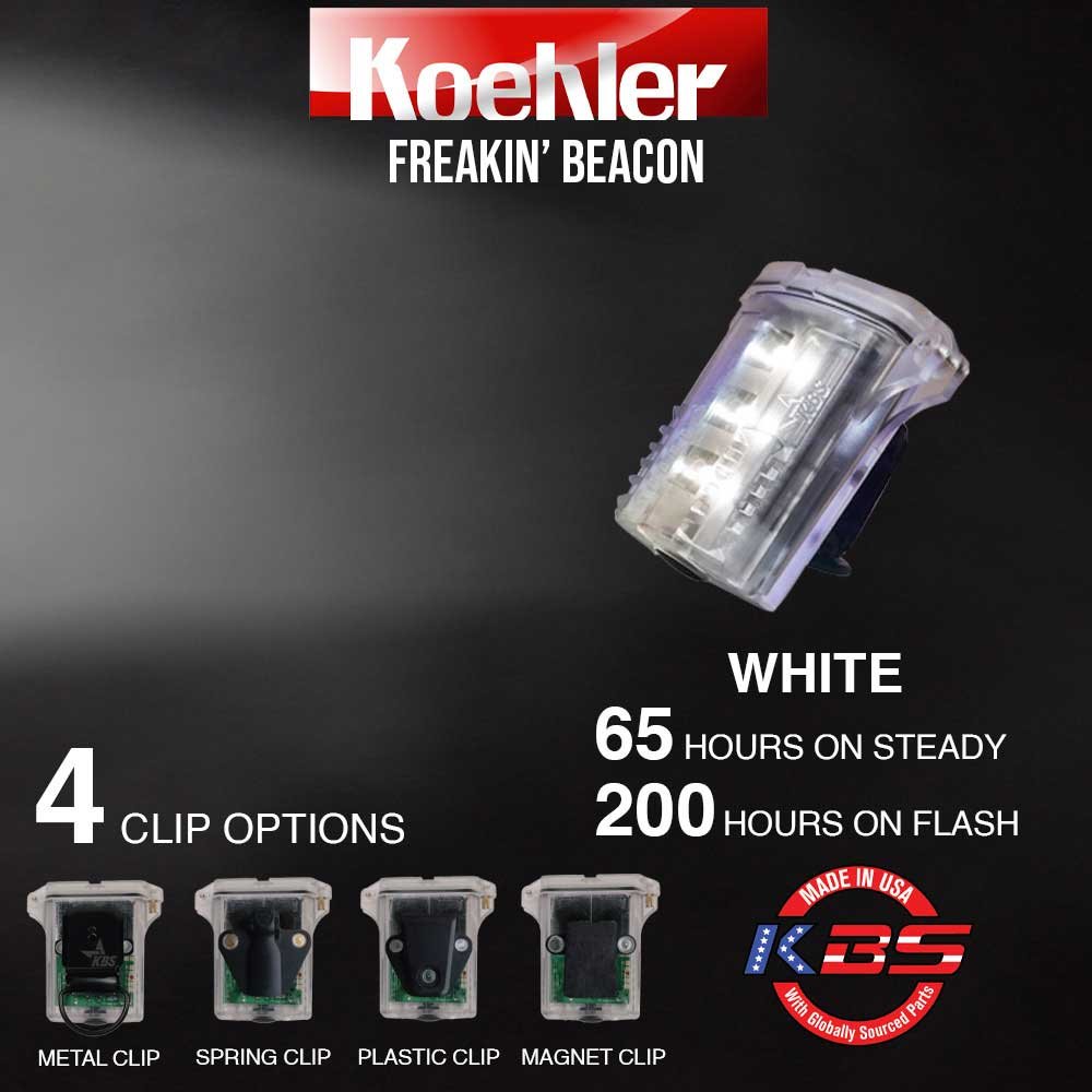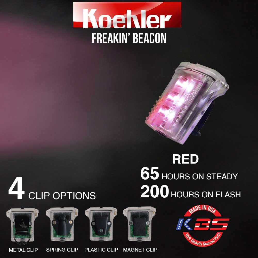 The Freakin’ Beacon™ comes in multiple colors and it runs up to 25 work days! The green color runs 36 hours on steady and 144 hrs. on flash. The blue color runs 48 hours on steady and 192 hours on flash. The red, white and amber colors run 65 hours on steady and 200 hours on flash. Powered by just 2 AAA alkaline batteries, the Freakin’ Beacon is a Class I, Division 1 light with an IP67 rating. That means it is dust proof, waterproof and will be able to survive underwater at one meter’s depth for 30 minutes. The large push-button switch is designed for easy operation with a gloved hand. The Freakin’ Beacon attaches directly to helmet or hard hat. You can choose from several back attachments, including a metal clasp, plastic or spring clip or a magnet mount . A 3M dual lock is included standard with all attachments.