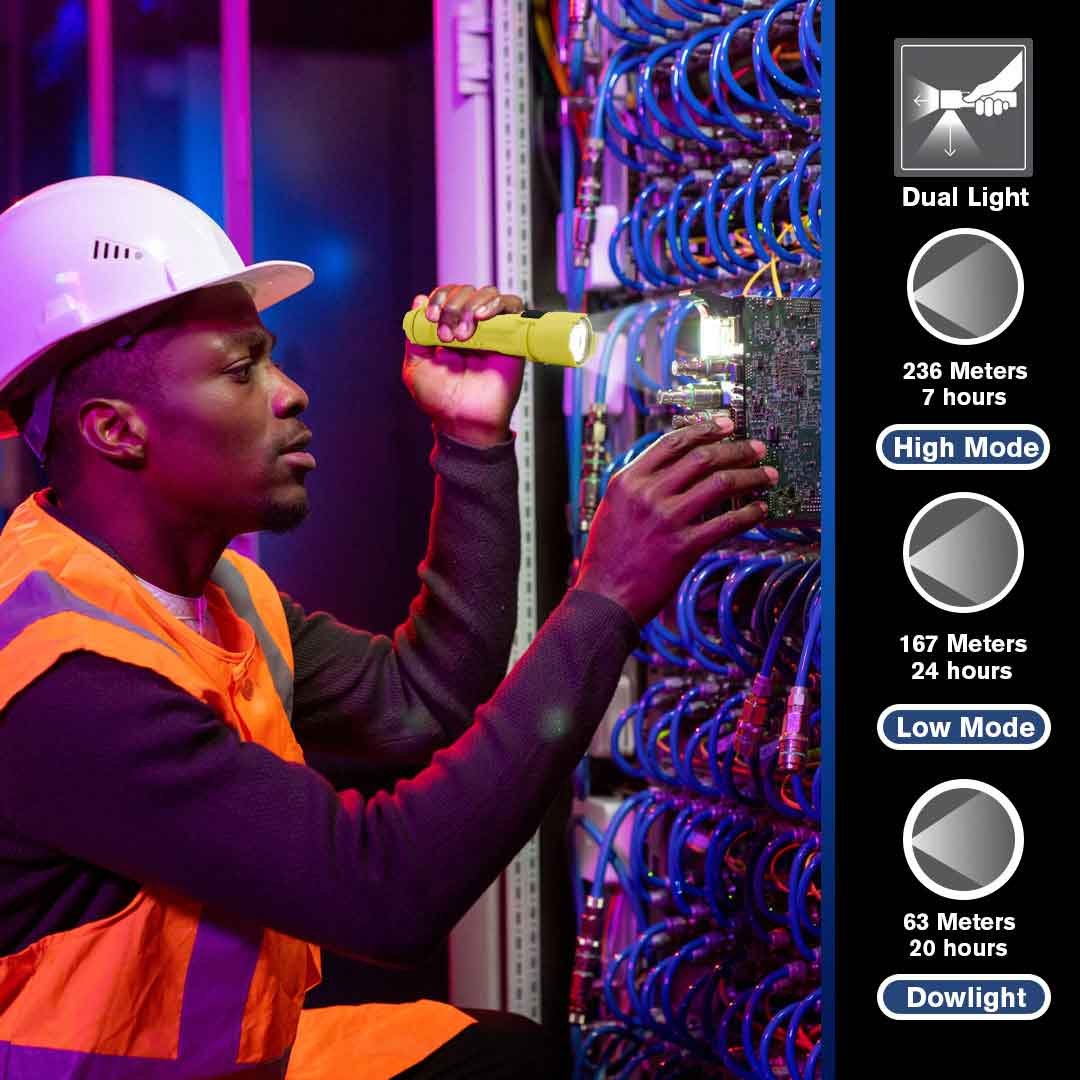 The Razor FSL is a compact, Class I, Division 1 intrinsically safe LED flashlight featuring a dual-beam design that combines a forward beam with a downlight. Built for professionals who need enhanced visibility and safety in dark, hazardous environments.